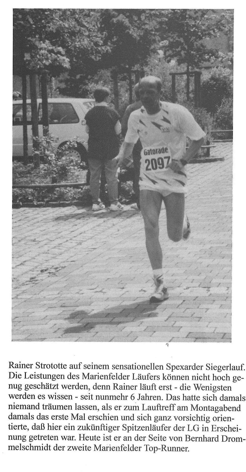 Die Laufgruppe hatte mit 38 Aktiven am 27. Hermannslauf teilgenommen. Neben dem Spitzenläufer Bernhard Drommelschmidt, der die 30,7 km in 2h6min. lief, freute sich Gisela Flunkert über einen jungen Läufer, der erst vor 6 Jahren mit dem Lauftraining begonnen hatte und mit 2h7min eine sensationelle Zeit lief. Der Name des jungen Talents lautete Rainer Strototte.