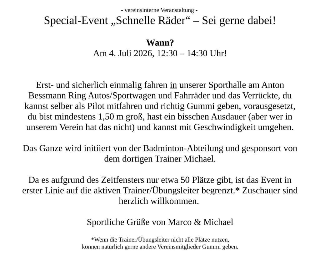 Im Rahmen unseres Sommer-Aktionstages "Badminton und mehr" könnt ihr den ganzen Tag (11 - 18 Uhr) Badminton spielen und, sofern Lust und Interesse bestehen auch an dem Special-Event "Schnelle Räder" teil nehmen. Merkt euch den Termin gerne schon mal vor.